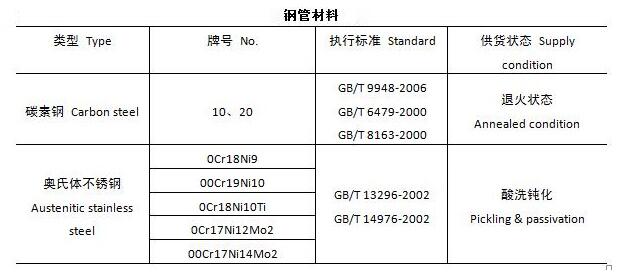 制造螺旋扁管換熱管的無(wú)縫鋼管應(yīng)采用整根管子,不允許拼接。常用鋼管的材料見(jiàn)表