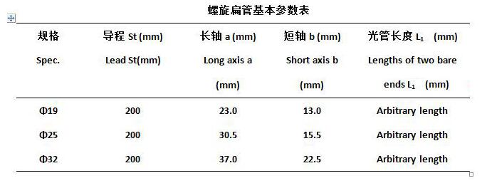 注:上表為標(biāo)準(zhǔn)型螺旋扁管基本參數(shù),若有特殊要求,可按需要的導(dǎo)程及長(zhǎng)軸值制造螺旋扁管。